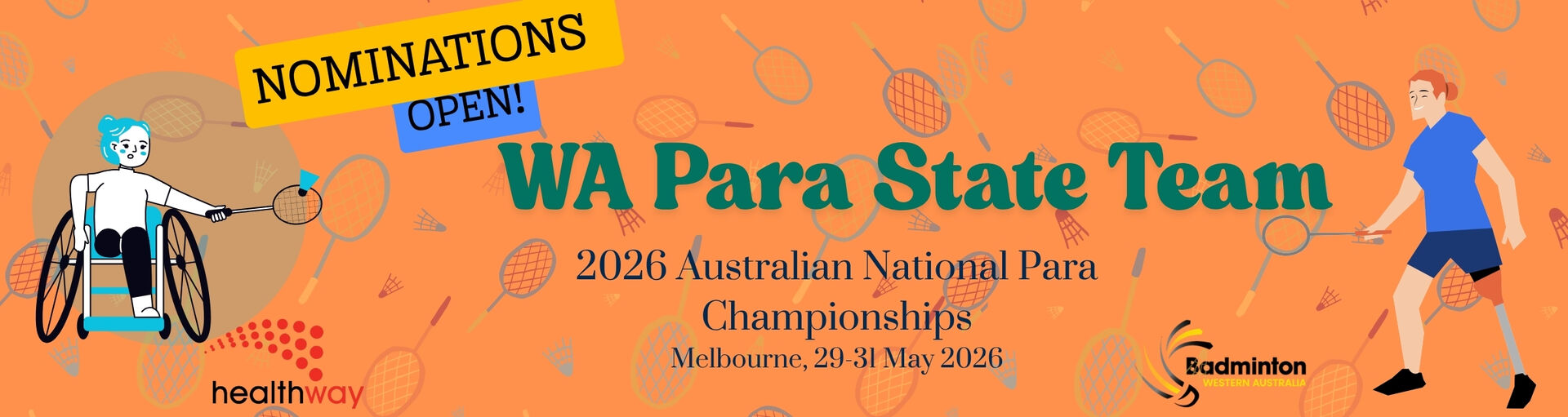 WA Para State Team Nominations - 2026 Australian National Para Championships, Melbourne, 29-31 May 2026: https://badmintonwa.waarble.com/ParaStateTeam